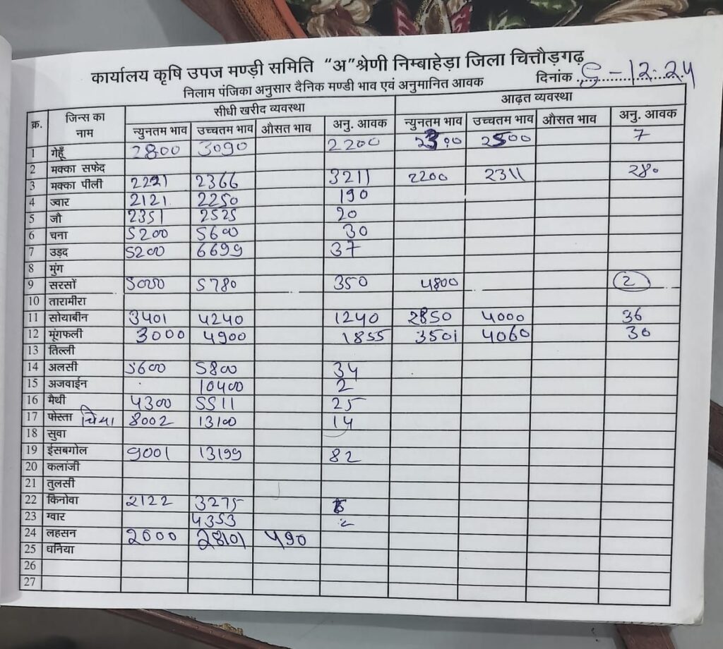 निम्बाहेड़ा। निम्बाहेड़ा कृषि उपज मंडी में आज 05 दिसम्बर को कृषि जिंसों के भाव इस तरह से रहे।