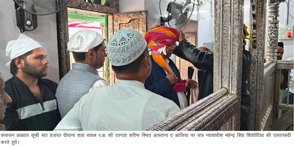कपासन। प्रख्यात सूफी संत हजरत दीवाना शाह साहब र.अ. की दरगाह शरीफ पर जिला एवं सत्र न्यायाधीश महेन्द्र सिंह शिशोदिया ने मुख्य मजार पर फूल पेश कर की मुल्क में अमनो सुकून की दुआ।