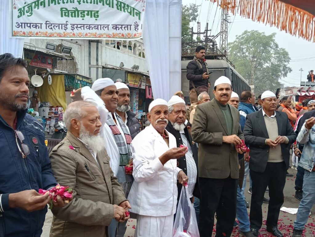 चित्तौड़गढ़। अखिल भारतीय भारतवर्षीय र्श्री गुर्जर गोड ब्राह्मण महासभा का गुरूवार 26 दिसम्बर को खुला राष्ट्रीय महा अधिवेशन किया गया जिसमें जुलूस के रूप में शोभायात्रा पाडन पोल से रवाना होकर भरत बाग पहुंचे। इस शोभायात्रा के दौरान मुस्लिम समाज की शीर्ष संस्था अंजुमन मिल्लते इस्लामिया संस्थान चितौड़गढ़ द्वारा भाईचारा और शांति का पैगाम देते हुए अंजुमन मिल्लते इस्लामिया संस्थान चितौड़गढ़ द्वारा दिलाई इस्तकबाल का गेट व बैनर लगा कर उस शोभायात्रा में भारत वर्ष के कोने-कोने से आने वाले मानुभावो मेहमानों का पुष्प वर्षा कर स्वागत सत्कार किया गया। जिसमें अंजुमन से जुड़े पदाधिकारी व मुस्लिम समाज के अन्य संगठन के लोगों ने क़ाज़ी पीया सरकार दरगाह के सामने गोलप्याउ पर भाईचारे का पैगाम देते हुए शोभायात्रा पर पुष्प वर्षा कर अपने भाइयों का आने वाले मेहमानों का ब्राह्मण समाज का स्वागत सत्कार किया गया। जिन्होंने शोभायात्रा में चल रहे चित्तौड़गढ़ सांसद सीपी जोशी व राष्ट्रीय श्री गुर्जर गौड़ ब्राह्मण महासभा के प्रदेशाध्यक्ष ओम प्रकाश उपाध्याय और पधारे हुए विशिष्ट अतिथि और संगठन के पदाधिकारीयों को माला पहनाकर पुष्प वर्षा की और स्वागत सत्कार किया गया जो एक शौर्य और वीर धरती चित्तौड़गढ़ के इतिहास को दर्शाता है।