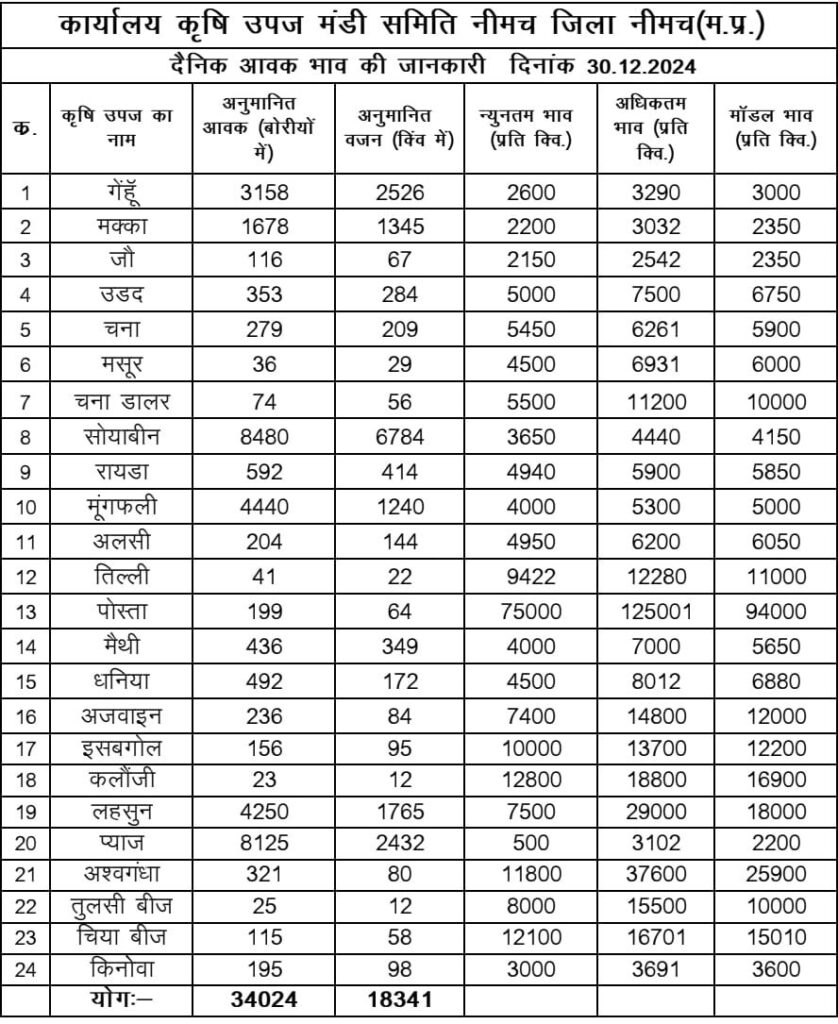 नीमच कृषि उपज मंडी में आज 30 दिसम्बर को कृषि जिंसों के भाव इस तरह से रहे।
