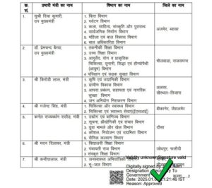 नई लिस्ट के मुताबिक, उपमुख्यमंत्री दिया कुमारी को अजमेर के साथ ब्यावर जिले का प्रभारी मंत्री बनाया गया है. पहले दिया कुमारी के पास अजमेर के साथ केकड़ी जिले का प्रभार था. वहीं, डिप्टी सीएम प्रेमचंद बैरवा को भीलवाड़ा और राजसमंद का जिला प्रभारी नियुक्त किया गया, जबकि पहले उनके पास चित्तौड़गढ़, राजसमंद और प्रतापगढ़ की जिम्मेदारी थी. गजेंद्र सिंह अब बीकानेर और जैसलमेर ज़िले के प्रभारी होंगे. कर्नल राज्यवर्धन सिंह रौठाड़ के पास सिर्फ एक जिला दौसा का प्रभार है. अब चित्तौड़गढ़ और प्रतापगढ़ के लिए सार्वजनिक निमार्ण विभाग, महिला एवं बाल विकास और बाल अधिकारिता विभाग की राज्यमंत्री डॉ. मंजू बाघमार को जिला का प्रभारी मंत्री बनाया गया हैं. संसदीय कार्यमंत्री जोगाराम पटेल के पास जयपुर जिले की जिम्मेदारी है, जबकि सुरेश सिंह रावत के पास भरतपुर और डीग का प्रभार है. वहीं, झाबर सिंह खर्रा के जिले में बदलाव करते हुए अब पाली जिले का प्रभारी मंत्री बनाया गया है, पहले उनके पास पाली और ब्यावर जिले की जिम्मेदारी थी. हीरालाल नागर के पास पहले की तरह टोंक और बूंदी जिले का प्रभार बरकरार है. इसके अलावा, अविनाश गहलोत के पास चूरू और झुंझुनूं, सुमित गोदारा के पास गंगानगर और हनुमानगढ़, जोराराम कुमावत के पास बाड़मेर और बालोतरा, बाबूलाल खराड़ी के पास बांसवाड़ा और डूंगरपुर, हेमंत मीणा के पास उदयपुर और सलूम्बर जिले का प्रभार है.