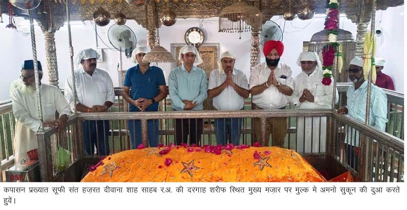 कपासन। प्रख्यात सूफी संत हज़रत दीवाना शाह साहब र.अ. की दरगाह शरीफ पर रिटायर्ड जिला एवं सत्र न्यायाधीश अरूण कुमार पारिक ने अपने साथियों के साथ चादर व फूल पेश कर मुल्क में अमनो सुकून की दुआ की। दरगाह वक्फ कमेटी के सैक्रेट्री मोहम्मद अब्बास अशरफी के अनुसार रिटायर्ड जिला एवं सत्र न्यायाधी अरूण कुुमार पारिक के साथ जयपुर के भा.ज.पा. नेता एवं एडवोकेट सरदार इन्द्र मोहन, दीपक सिंह, पूर्व उपराष्ट्रपति जगदीप धनखड के भानेज प्रवीण धनखड के साथ भा.ज.पा. अल्पसंख्यक के पूर्व जिला अध्यक्ष एडवोकेट सैयद अशफाक अली व हाजी सैयद अशरफ अली ने चादर व फूल पेश कर मुल्क मे अमनों सुकून की दुआ की। वक्फ कमेटी सदस्य एवं नगरपालिका उपाध्यक्ष सैयद ऐजाज अली, असलम शैख, हाजी साबिर पुंवार, हाजी शराफत भाटी, हाजी अब्दुर्रहमान मंसूरी ने सभी की दस्तारबंदी कर श्रीफल भेंट किया।