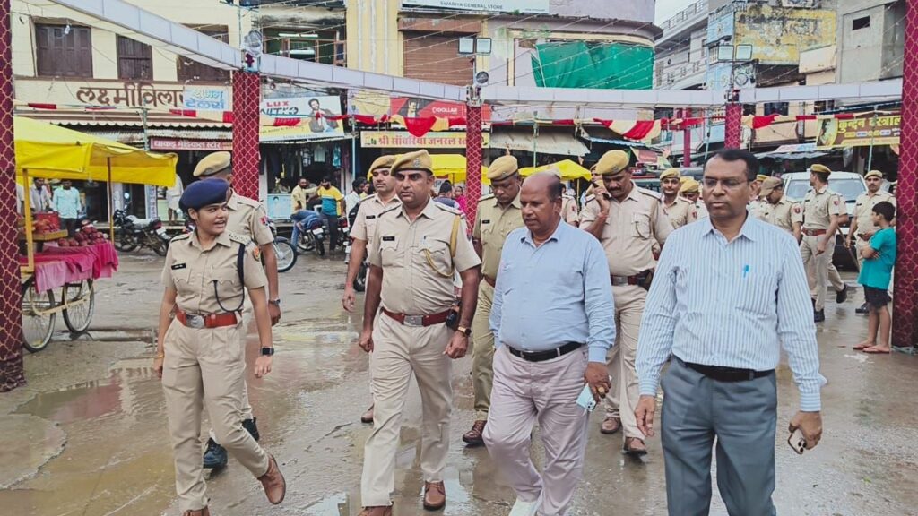 बेगूं। आगामी बारावफात और अनंत चतुर्दशी पर्वों को लेकर गुरुवार को बेगूं नगर में पुलिस और प्रशासन की ओर से फ्लैग मार्च निकाला गया। फ्लैग मार्च की शुरुआत लालबाई-फूलबाई चौक से हुई, कतला चौक, गांधी चौक, बड़ी मस्जिद, दमाजी की हवेली, चाँद तारा बिल्डिंग होते हुए आखरिया चौक तक निकाला गया। इस दौरान पुलिस बल ने पैदल मार्च कर आमजन को शांति, सुरक्षा और सौहार्द का संदेश दिया।