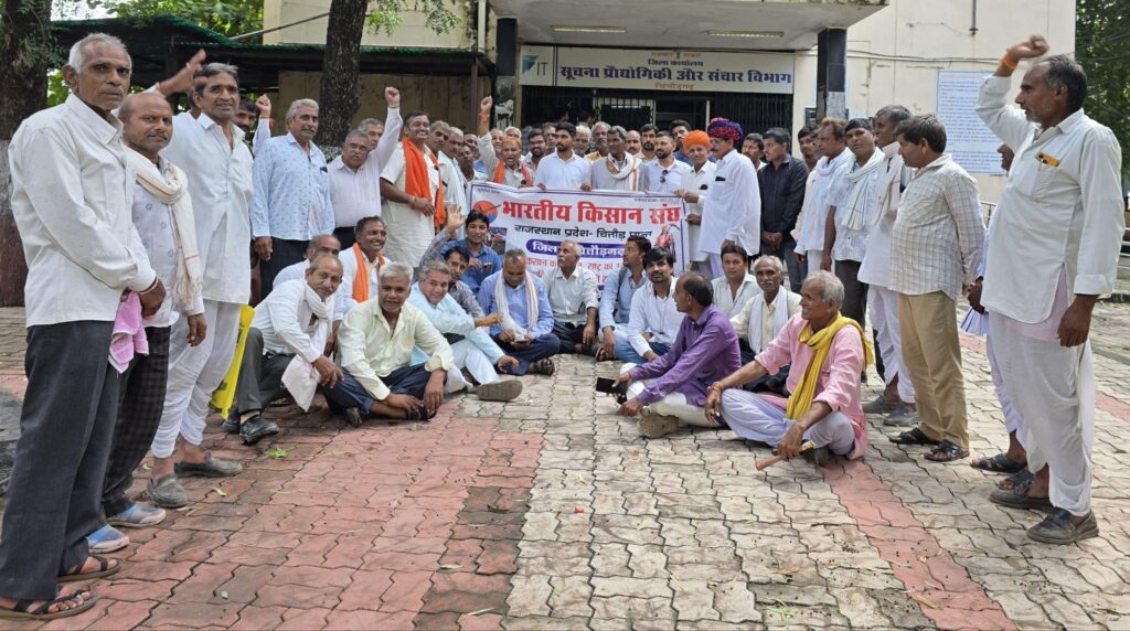 चित्तौड़गढ़। भारतीय किसान संघ ने जिला मुख्यालय पर कई किसानों ने सोमवार को फसल खराबे और 12 अन्य मांगों को लेकर धरना प्रदर्शन कर प्रधानमंत्री, मुख्यमंत्री, केंद्रीय कृषि मंत्री और राज्य कृषि मंत्री के नाम दोपहर 1 बजे अतिरिक्त जिला कलेक्टर प्रभा गौतम को ज्ञापन सौंपा। भारतीय किसान संघ के प्रतिनिधि मण्डल ने अतिरिक्त जिला कलेक्टर से वार्ता कर उन्हें ज्ञापन दे कर बताया कि जिले में लगातार हो रही अतिवृष्टि से किसानों की फसल गल कर नष्ट हो गई है। किसानों के पशुओं के रहने के लिए बने शेड भी ढह गए। पशुओं के खाने का चारा भी गल कर नष्ट हो गया है, जिससे जिले में चारा का भी संकट पैदा होने लगा है। ज्ञापन में किसानो की उनकी उपज का का लाभकारी मूल्य देने, सम्पूर्ण उपज को एमएसपी पर खरीद करने, खरीद केंद्रों की संख्या बढ़ाने, सिंचाई, बिजली, पशुपालन, सहकारिता, मनरेगा, यूवा किसान, महिला किसान से और फर्टिलाइजर की उपलब्धता सुनिश्चित करने सहित 12 अन्य मागों को लेकर ध्यान आकर्षित किया गया।
