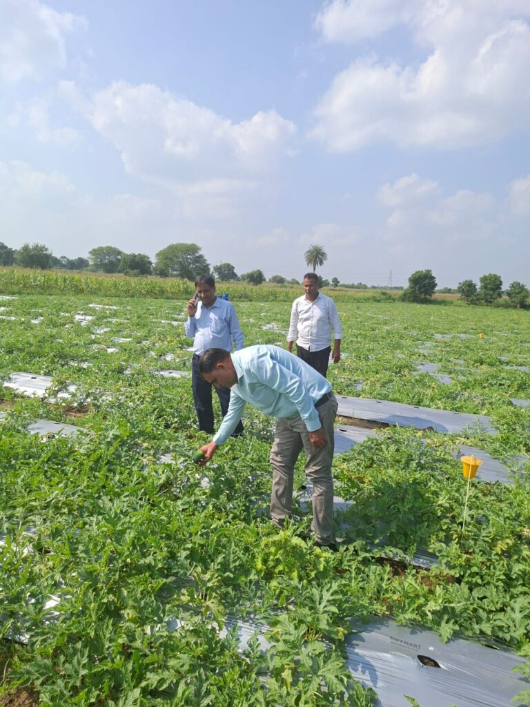 डुंगला। तहसील के ग्राम घोड़ा खेड़ा निवासी प्रगतिशील किसान श्री देवीलाल जाट ने खरीफ सीजन में तरबूज की खेती कर जिले में नई पहल की है। सामान्यतः तरबूज की खेती केवल ज़ायद सीजन में की जाती है, किंतु खरीफ में इसकी सफल खेती कर उन्होंने बेहतर उत्पादन प्राप्त किया है। संयुक्त निदेशक उद्यान, भीलवाड़ा महेश चेजरा एवं उप निदेशक उद्यान, चित्तौड़गढ़ डॉ. शंकर लाल जाट ने उनके खेत का निरीक्षण कर फसल की सराहना की।