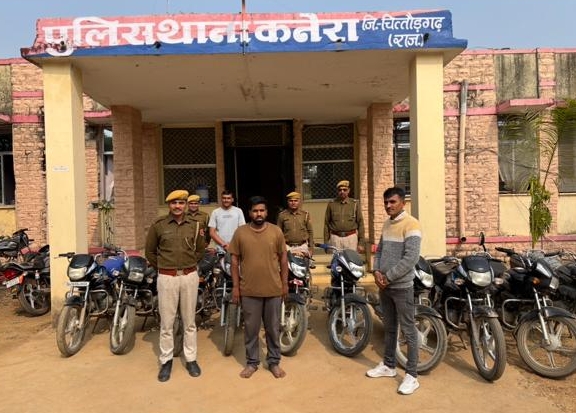निम्बाहेड़ा। कनेरा थाना पुलिस ने मोरसाईकिल चोरी करने वाले अंतरराज्यीय वाहन चोर को गिरफतार कर उसके कब्जे से चोरी की 11 मोटरसाईकिले बरामद की है। एमपी व निम्बाहेड़ा से मोटर सायकिलें चोरी की गई थी। जानकारी के अनुसार 21 नवम्बर को बस स्टेण्ड कनेरा से मोहम्मद जहिर पुत्र मोहम्मद सददीक रंगरेज की मोटरसाईकिल शाम को कोई अज्ञात बदमाश उठा कर ले गया। जिसकी आस पास में काफी तलाश की मगर कोई पता नही चला। जिस पर प्रकरण दर्ज किया जाकर अनुसंधान शुरू किया गया। कनेरा थानाधिकारी श्यामलाल उ.नि. के नेतृत्व मे पुलिस कि टीम गठित कि गई। पुलिस ने मुखबीर मामुर कर अज्ञात आरोपियों की तलाश शुरू की गई। तलाशी के दौरान संग्दिध 24 वर्षीय मुकेश कुमार पुत्र बगदीराम जाति गायरी (धनगर) निवासी हडमनतिया (हनुमानंटिया) थाना जावद जिला नीमच मध्यप्रदेश को डिटेन किया जाकर गहन अनुसंधान कर मनौवैज्ञानिक तरीके से पुछताछ कि गई। पुछताछ मे आरोपी ने 21 नवम्बर को उक्त मोटर साईकिल बस स्टैण्ड कनेरा से चोरी कर ले जाना बताया। जिस पर आरोपी को गिरफतार कर पुछताछ व अनुसंधान किया जाकर प्रकरण का वाहन व अन्य 10 चोरी में सदिग्ध मोटरसाईकिल को बरामद की गई। गिरफ्तार आरोपी ने जावद, अठाना, खोर, निम्बाहेडा के एरिया से मोटरसाईकिल चुराना बताया।