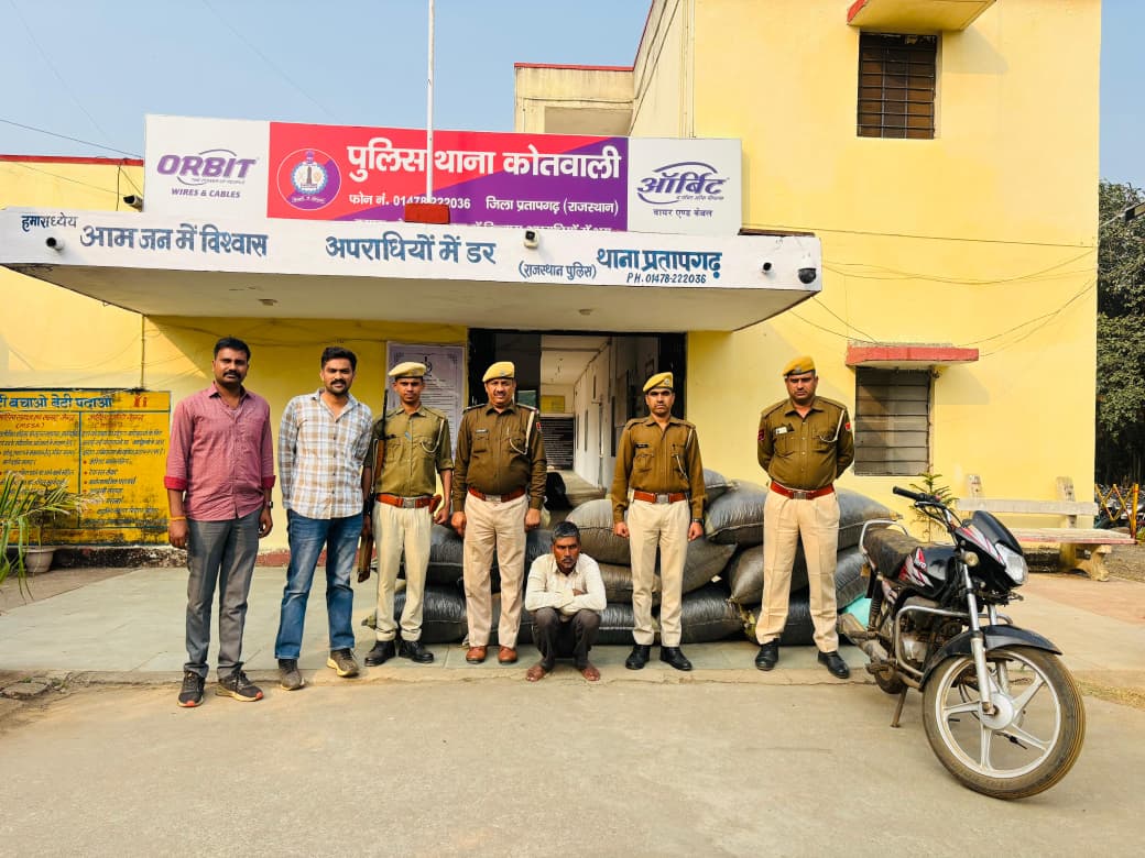 जयपुर। जिला पुलिस अधीक्षक प्रतापगढ़ बी. आदित्य के निर्देशन में अवैध मादक पदार्थों की तस्करी पर नकेल कसने के लिए चलाए जा रहे विशेष अभियान ऑपरेशन चक्रव्यूह के तहत प्रतापगढ़ पुलिस ने दो अलग-अलग कार्यवाहियों में भारी मात्रा में अवैध अफीम डोडाचूरा जब्त किया है। मात्र दो दिनों के भीतर हुई इन कार्यवाहियों में कुल 5 क्विंटल 94 किलोग्राम अवैध डोडाचूरा जब्त किया गया है, जिसकी अनुमानित बाजार कीमत लगभग 89 लाख 8 हजार रुपये है। पुलिस ने परिवहन में प्रयुक्त दो वाहन और एक मोटरसाईकिल जब्त करते हुए दो अभियुक्तों को भी गिरफ्तार किया है। गुरुवार 27 नवम्बर को ऑपरेशन चक्रव्यूह के तहत थानाधिकारी प्रतापगढ़ दीपक बंजारा मय टीम गत संचई से अखेपुर की ओर जाने वाले कच्चे रास्ते पर गश्त कर रहे थे। इस दौरान एक मोटरसाईकिल पर दो व्यक्ति स्कोर्टिंग करते दिखे, जिनमें से पीछे बैठा व्यक्ति पुलिस को देखकर खेतों की तरफ भाग गया। टीम ने मोटरसाईकिल चालक गोविन्द पुत्र मुकन मीणा निवासी अखेपुर को पकड़ा। पीछे आ रहे ट्रैक्टर-ट्रॉली चालक ने भी पुलिस को देखकर ट्रॉली छोड़कर खेतो में भाग गया। ट्रॉली की तलाशी लेने पर उसमें काले रंग के 17 कट्टों में कुल 3 क्विंटल 38 किलो 890 ग्राम अवैध डोडाचूरा पाया गया। पुलिस ने डोडाचूरा, परिवहन में प्रयुक्त ट्रैक्टर-ट्रॉली और स्कोर्टिंग में प्रयुक्त मोटरसाईकिल को जब्त कर अभियुक्त गोविन्द मीणा को गिरफ्तार किया। इस डोडाचूरा की अनुमानित कीमत 50 लाख 83 हज़ार रुपये बताई गई है।