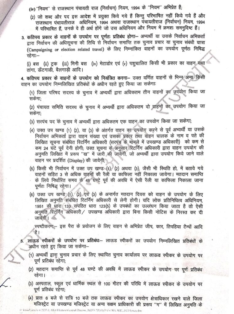 उम्मीदवारों को बस, ट्रक, मिनी बस, मेटाडोर, तांगा, ऊंटगाड़ी या बैलगाड़ी जैसे वाहनों से प्रचार करने की मनाही होगी। ऐसा करने पर आयोग द्वारा कार्रवाई की जाएगी। उम्मीदवारों को तय सीमा से अधिक खर्च करने की अनुमति नहीं होगी और चुनाव खर्च का ब्यौरा 15 दिन के भीतर जिला निर्वाचन अधिकारी को देना अनिवार्य होगा। इसके साथ ही चुनाव में प्रचार प्रसार के लिए वाहनों की संख्या को लेकर भी सीमा तय की गई है। जिला परिषद सदस्य के चुनाव में अधिकतम तीन वाहन उपयोग में ले सकेंगे। पंचायत समिति सदस्य उम्मीदवार 2 वाहन उपयोग कर सकेंगे। वहीं सरपंच प्रत्याशी केवल एक वाहन प्रचार में इस्तेमाल कर पाएंगे। इसी तरह शहरी निकायों के लिए नगर निगम पार्षद उम्मीदवार अधिकतम 3 वाहन, नगर परिषद पार्षद उम्मीदवार 2 वाहन, और नगर पालिका पार्षद उम्मीदवार एक वाहन उपयोग कर सकेंगे। नए नियमों के मुताबिक पंचायती राज के चुनाव में सरपंच एक लाख, पंचायत समिति सदस्य 1.5 लाख, जिला परिषद सदस्य 3 लाख ही खर्च कर पाएंगे। पहले सरपंच 50 हजार, पंचायत समिति सदस्य 75 हजार, जिला परिषद सदस्य केवल 1.5 लाख खर्च कर सकते थे यानी तीनों ही पद के लिए आयोग ने खर्च की सीमा दोगुनी कर दी है। इसके अलावा शहरी निकाय चुनाव में नगर निगम पार्षद पहले 2.5 लाख खर्च कर सकते थे, वे अब 3.5 लाख खर्च कर सकेंगे। नगर परिषद पार्षद पहले 1.5 लाख तो अब 2 लाख खर्च कर सकेंगे। नगर पालिका पार्षद पहले 1 लाख रुपए तो अब 2 लाख रुपए खर्च कर पाएंगे।