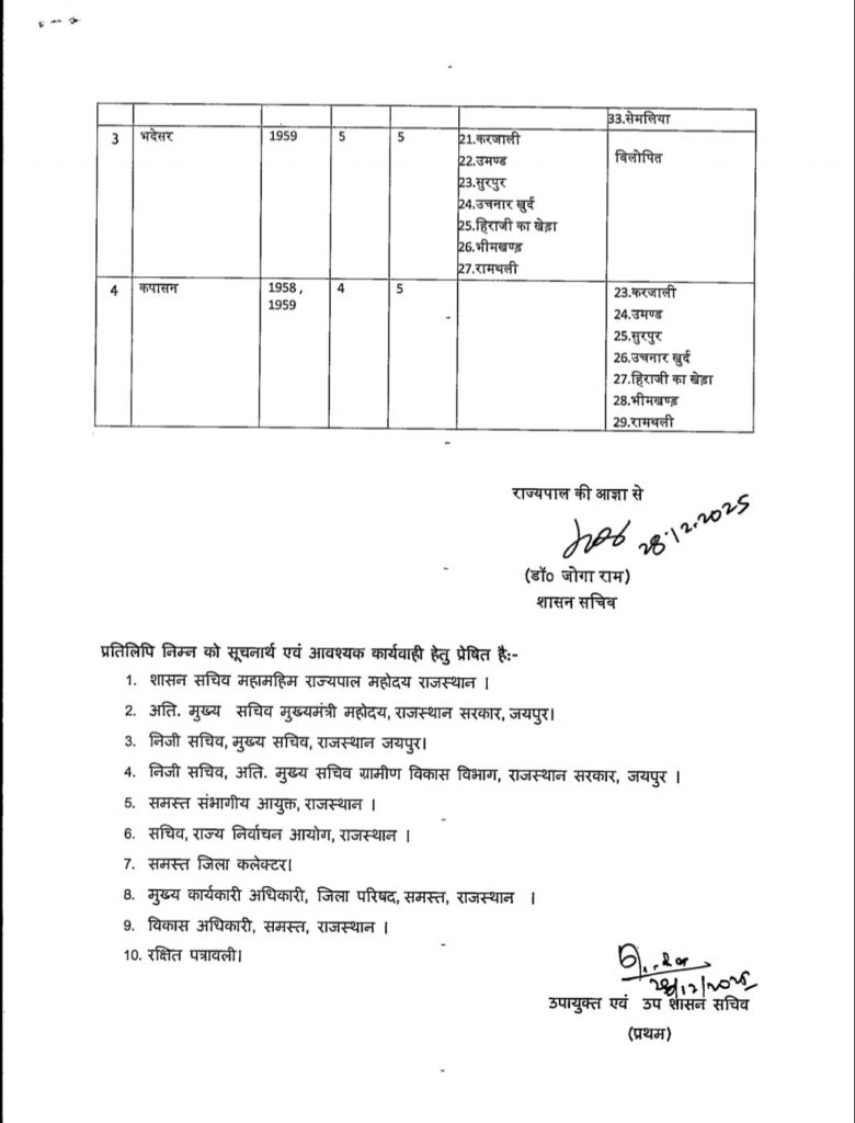 जयपुर। ग्रामीण विकास एवं पंचायती राज विभाग ने एक आदेश जारी कर जिला चित्तौडगढ की ग्राम पंचायतों एवं पंचायत समितियों के पुनर्गठन / पुनर्सीमांकन / नवसृजन बाबत दिनांक 21.11.2025 एवं 24.11.2025 को राजस्थान राजपत्र विशेषांक भाग 6 ( ग ) में प्रकाशित अधिसूचनाओं में लिपिकीय त्रुटिवश गलत प्रकाशन होने की वजह से व प्राप्त अभ्यावेदनों के निस्तारण पश्चात संशोधन कर शुद्धि पत्र जारी किया जाता है। चित्तौड़गढ़ जिले की कपासन पंचायत समिति की 7 ग्राम पंचायतों को भदेसर पंचायत समिति में जोड़ी गई थी लेकिन अब शुद्धि पत्र जारी होने के बाद भदेसर पंचायत समिति में शामिल की गई उमण्ड, रामथली, भीमखण्ड, करजाली, सुरपुर, उचनार खुर्द और हीराजी का खेड़ा को पुनः कपासन पंचायत समिति में शामिल कर दिया हैं। इसी तरह बेगू में शामिल की गई कुँवालिया, आकोडिया, मंडफिया, रघुनाथपूरा, करतियास, सडास, सुरजनियास, लालास, सारण और तुंबडिया ग्राम पंचायत को वापस गंगरार पंचायत समिति में शामिल किया गया हैं।