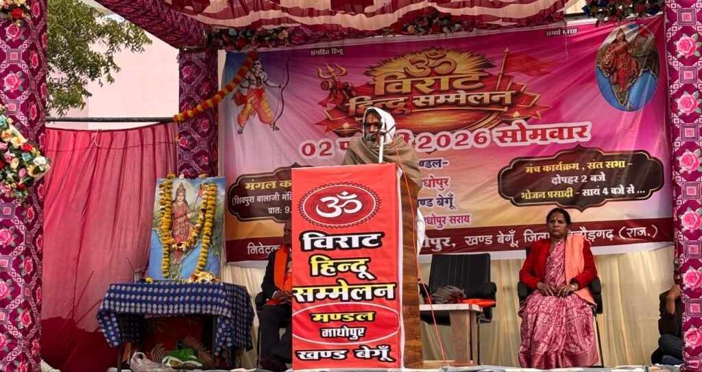 बेगूं। क्षेत्र के माधोपुर मंडल में सोमवार को विराट हिंदू सम्मेलन का भव्य एवं ऐतिहासिक आयोजन किया गया। कार्यक्रम का शुभारंभ प्रातः 11 बजे कलश यात्रा के साथ हुआ। कलश यात्रा शिवपुरा स्थित बालाजी मंदिर से प्रारंभ होकर माधोपुर सराय तक पहुंची। कलश यात्रा में मंडल क्षेत्र के सर्व हिंदू समाज के गणमान्य नागरिकों सहित महिलाओं, पुरुषों एवं बच्चों ने उत्साहपूर्वक भाग लिया। जयघोष और भगवा ध्वजों से पूरा क्षेत्र भक्तिमय वातावरण में रंगा नजर आया।
